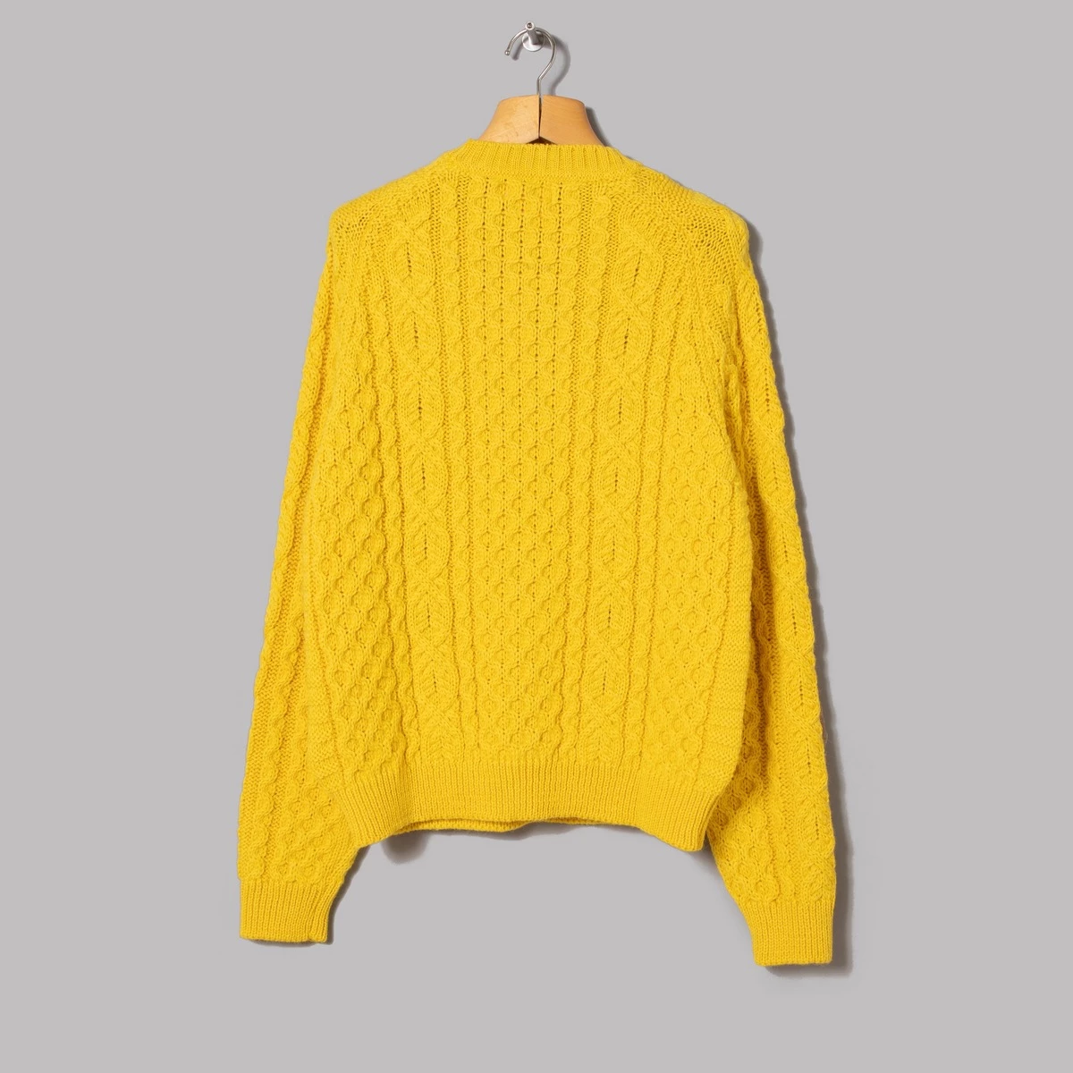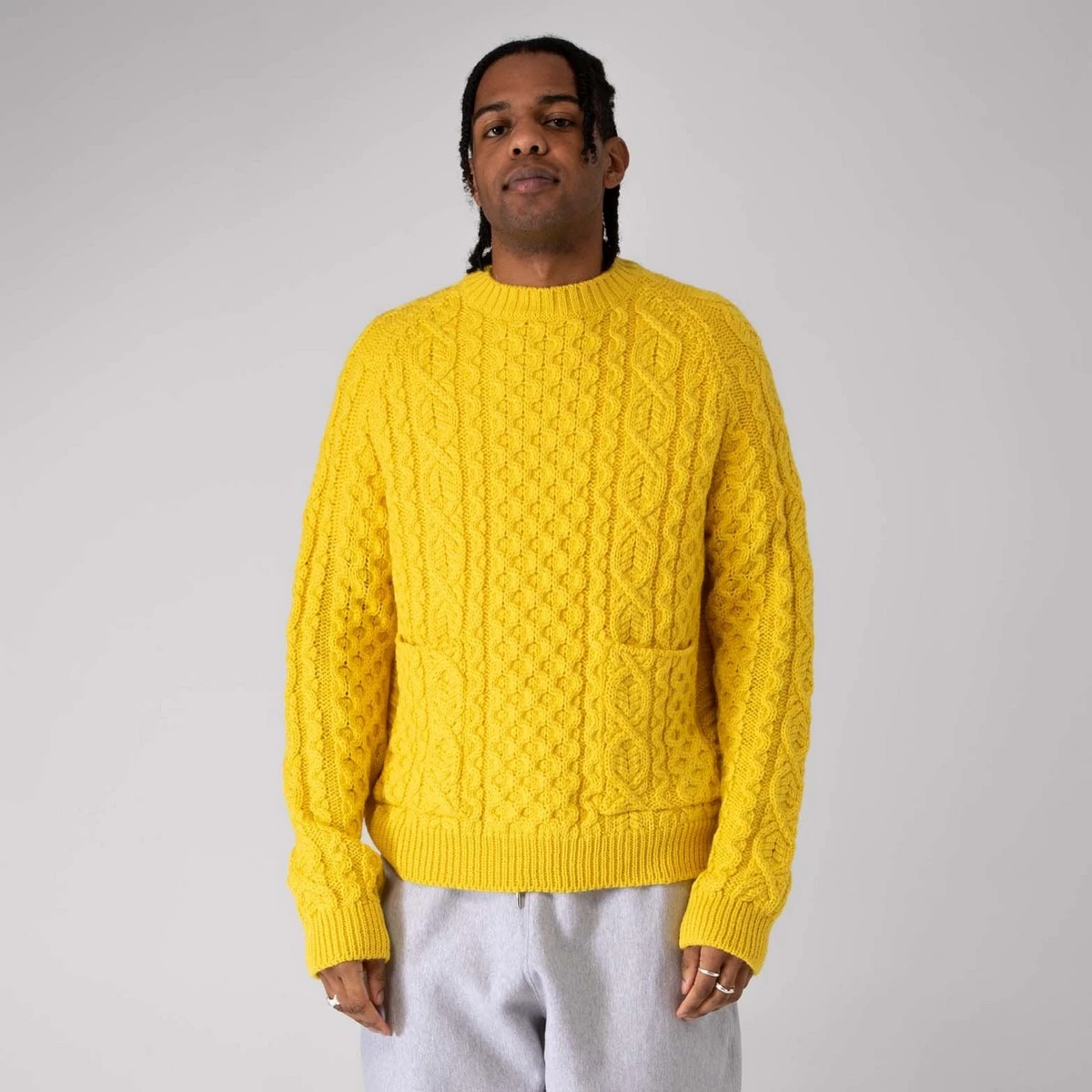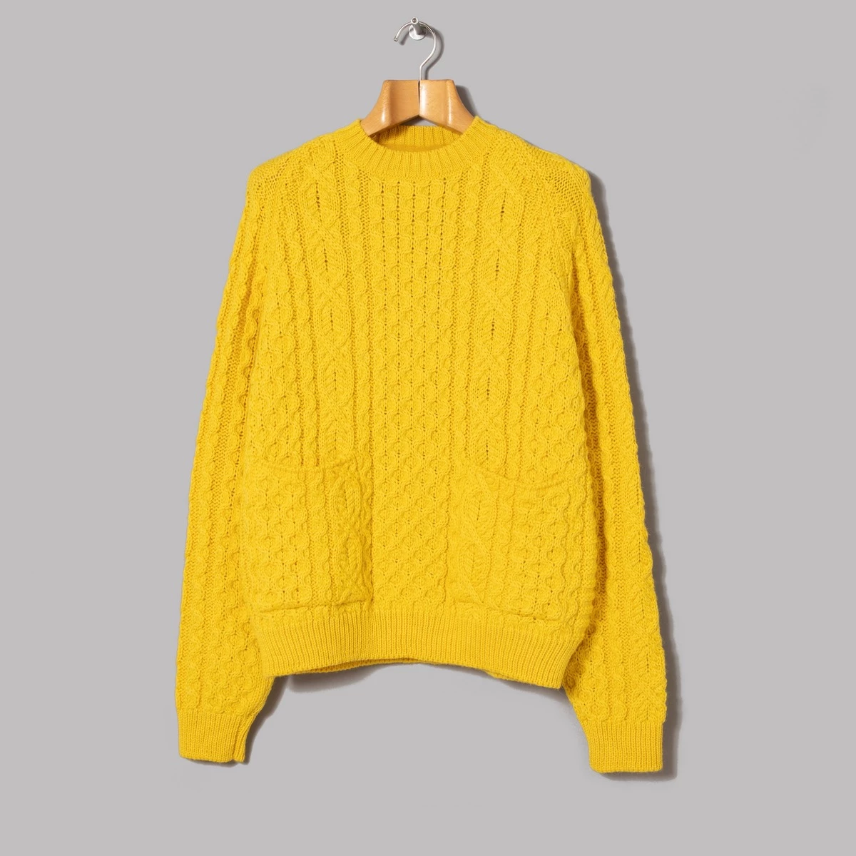 100% British wool. Aran knit. Ribbed crew neck, cuffs and hem. Two patch pockets. Made in England. Relaxed fit. Fans of staying warm can rejoice – we’ve made another round of Aran jumpers! This time, in some mind-fractillating new hues. Like most menswear hall-of-famers, the Aran jumper came from humble beginnings. First intended for Irish fishermen back in the 19th century (and usually knitted by their wives), these eventually found their way onto the torsos of the likes of David Bowie and Steve McQueen, thus cementing their place in the history books. Ours are made in England and sport that el classico chunky cable-knit pattern, with the added benefit of a relaxed fit, a low-profile collar, and precisely two ultra-useful patch pockets, meaning it’s a good deal more wearable than anything you’d find stacked in the back of a musty old gentlemen’s outfitters.