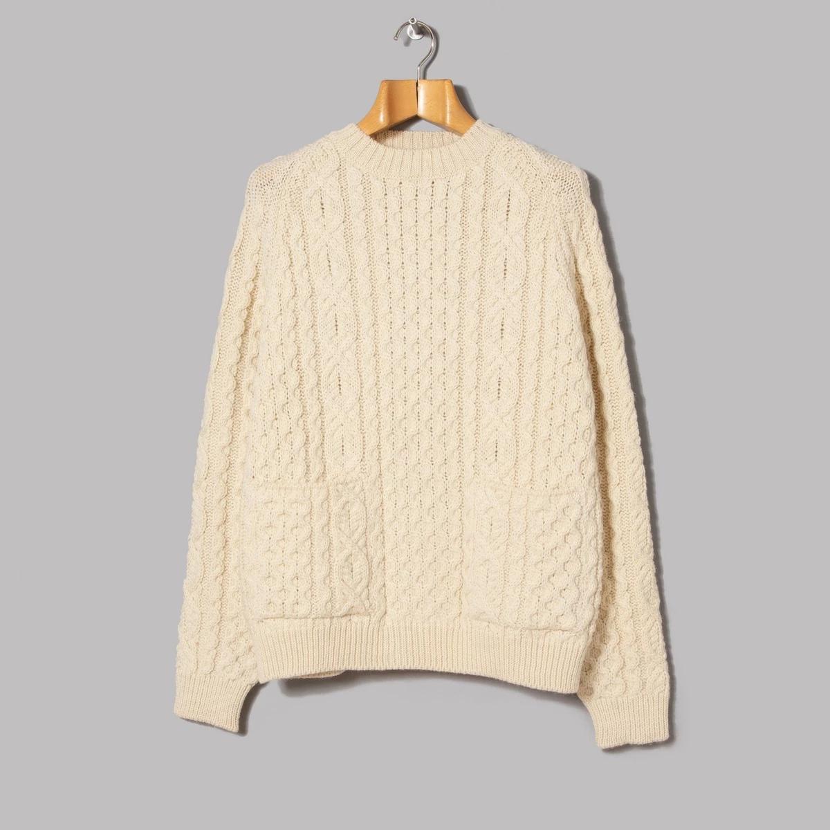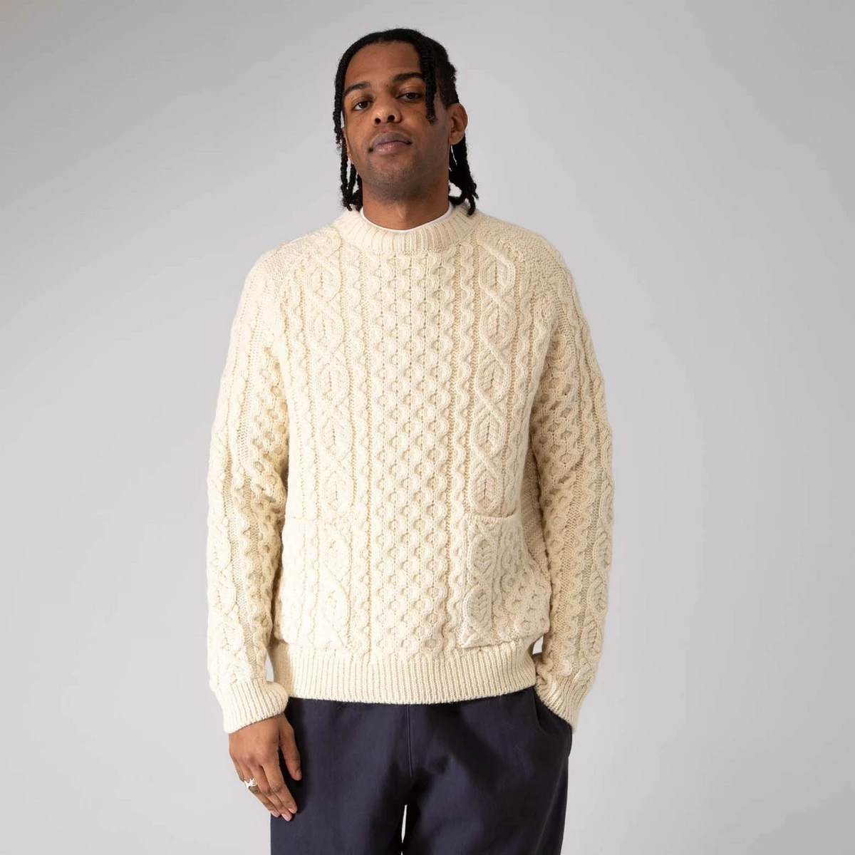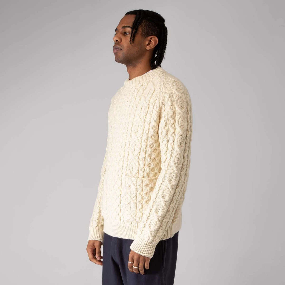 100% British wool. Aran knit. Ribbed crew neck, cuffs and hem. Two patch pockets. Made in England. Relaxed fit. Fans of staying warm can rejoice – we’ve made another round of Aran jumpers! This time, in some mind-fractillating new hues. Like most menswear hall-of-famers, the Aran jumper came from humble beginnings. First intended for Irish fishermen back in the 19th century (and usually knitted by their wives), these eventually found their way onto the torsos of the likes of David Bowie and Steve McQueen, thus cementing their place in the history books. Ours are made in England and sport that el classico chunky cable-knit pattern, with the added benefit of a relaxed fit, a low-profile collar, and precisely two ultra-useful patch pockets, meaning it’s a good deal more wearable than anything you’d find stacked in the back of a musty old gentlemen’s outfitters.