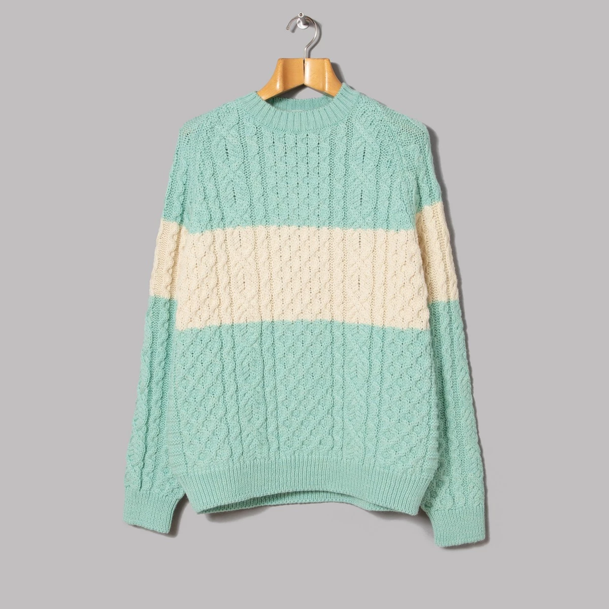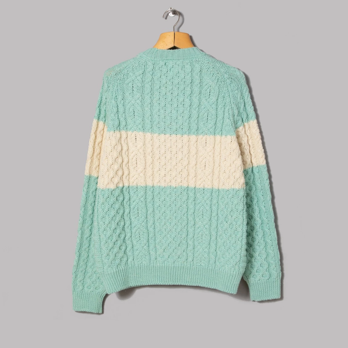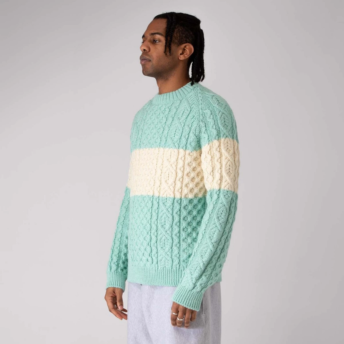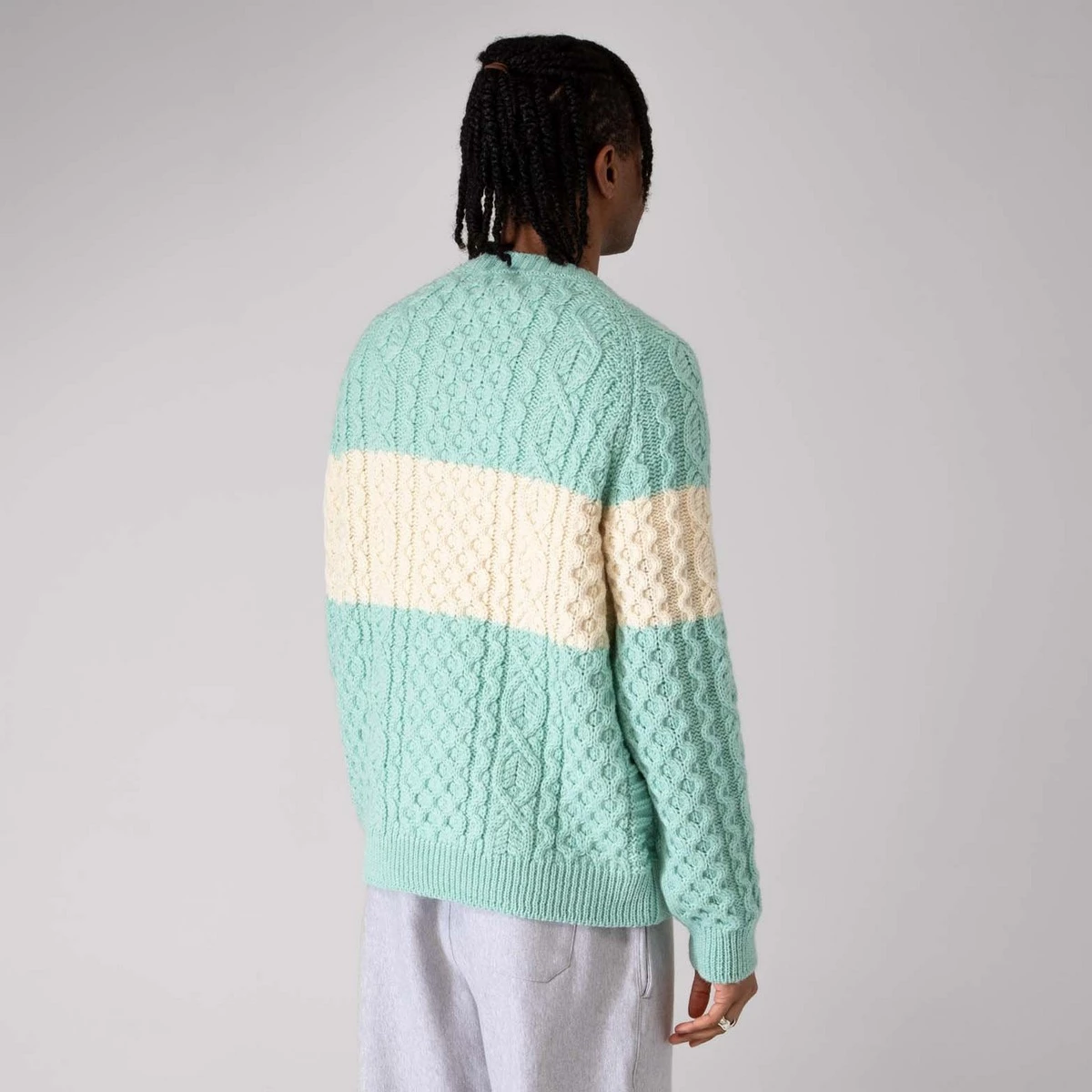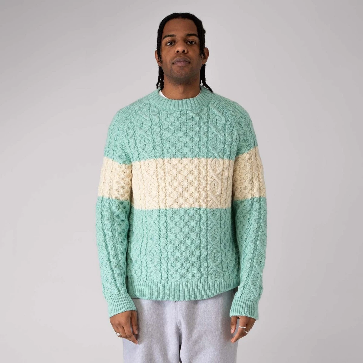 100% British wool. Aran knit. Ribbed crew neck, cuffs and hem. Made in England. Relaxed fit. Fans of staying warm can rejoice – we’ve made another round of Aran jumpers! This time, in some mind-fractillating new hues. Like most menswear hall-of-famers, the Aran jumper came from humble beginnings. First intended for Irish fishermen back in the 19th century (and usually knitted by their wives), these eventually found their way onto the torsos of the likes of David Bowie and Steve McQueen, thus cementing their place in the history books. Ours are made in England and sport that el classico chunky cable-knit pattern, with the added benefit of a relaxed fit and a low-profile collar, meaning it’s a good deal more wearable than anything you’d find stacked in the back of a musty old gentlemen’s outfitters.